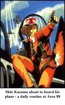 Given the context, it seems to be the last place to find a man man like Shin Kazama, formerly known for his kind peaceful nature. Unraveling the mystery on how he got there began to reveal how fascinating the man truly is. Shin is humble, but more than that does not like to discuss his past. Instead I had to piece together his story from other sources. Not long ago Shin was training to become a pilot in France. Shin was ranked top of his class and seemed destined to get a good job as an airline pilot once he graduated. It's also known that Shin dated Ryoko Tsugumo; daughter of the president of Yamanto Airlines (YAL). Running from a relationship gone bad seems a likely explanation, however Shin and Ryoko were known to be very in love and never showed signs to the contrary. So why would a man who had everything give it up for the nightmare of Area 88? On the night he graduated, Shin went out drinking to celebrate but was tricked into signing a contract with the Arslan air force. Some rumors say it may have been his friend Satoru Kanzaki who tricked him, although this has never been confirmed. Satoru is now an influential pilot working at YAL, now living the life Shin had dreamt of after graduation.