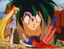 Fairy Princess RenAlso known as: Elf Princess Rane Summary: >If you had a set of jumper cables hooked up to the nipples of Indiana Jones, you'd get a guy like Go. Go is always in search of treasure, and for once he finds a clue which could actually lead him there. He finds an elf named Rane. Go and Rane have a ... language barrier, but the two seem to know enough that they could help each other. Even with a lot of obstacles facing them, they seem to be on the right track... even though they're not exactly sure what they're searching for. Thoughts: >Some would call this anime charming, others would call it funny. It is perhaps both of these things, but most of all, it's absolutely INSANE. In between laughing now and then, I found myself saying... "what the hell?!.." The story has a very strange coherency, that is fairly hard to follow. Fairy Princess Ren is blatant, in-your-face, and very confusing; but I believe that is what gives this anime its charm. For an anime veteran such as myself, I found this title to be rather interesting, but I would recommend that people who are new to anime avoid it. It will simply overwhelm the uninitiated. The subtitles come at about a million miles an hour (but that can't be helped), and even I had a hard time keeping up, and I think of myself as a fairly capable subtitle reader. One of the characters also talks backwards, and I think it was a rather poor decision to subtitle backwards as well. Sort of voids the point of subtitles doesn't it? If you think you can keep up with the subtitles, and you're looking for a totally outrageous anime, this is it. I rather liked it.... but I'm weird like that. I have deemed this anime the title of "Most insane anime ever". And as such I've found some people have actually challenged this, but don't confuse "insane" with "stupid". Yes, I have yet to see any anime this insane that approaches Fairy Princess Ren, even discounting the stupidity in many other titles. Screen Caps: >